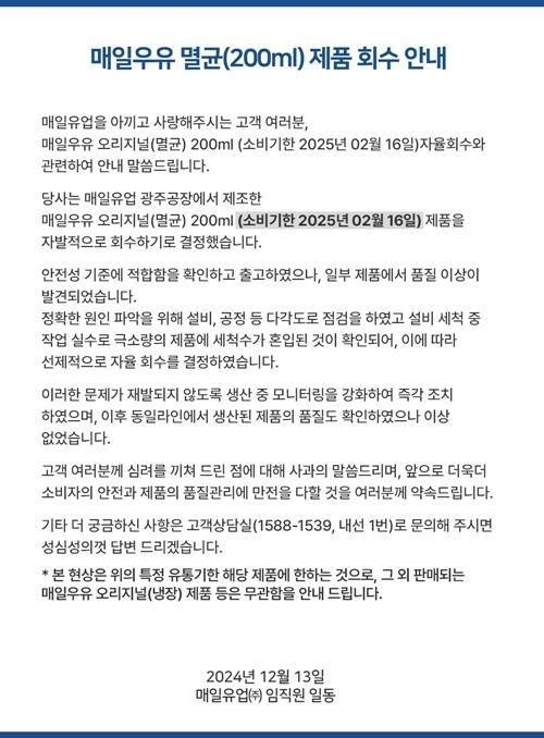매일유업은 이 문제를 인정하고 소비기한 2025년 2월 16일 제품에 대해 자발적으로 회수 조치를 시작했습니다.